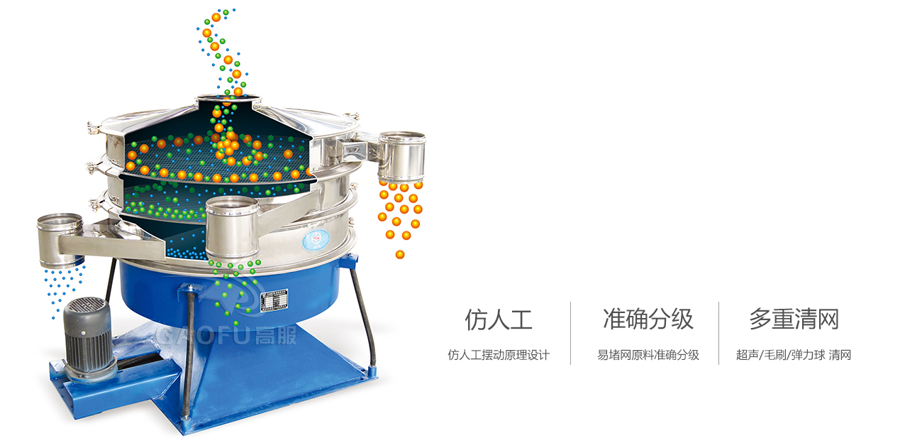 搖擺篩是一種仿人工搖動的低頻旋振篩,其原理是:瞬時運動為沿徑向的位移和以此位移為軸的圓周運動的合成(螺旋運動),即可調(diào)節(jié)偏心距的激振器產(chǎn)生了非線性三維運動,物料也產(chǎn)生同樣的近似手動作業(yè)的運動,從而達(dá)到篩分之目的,再配合篩分附件可獲得更加理想的篩分效果適合于圓形狀、圓柱狀、片狀、乃至 于規(guī)則形狀易堵網(wǎng)且需要精細(xì)篩分的物料。